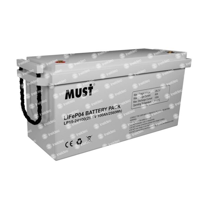 Batería de Litio LIFEPO4 125Ah 24V Must con BMS incorporado. Tiene un diseño con altos estándares de calidad, versatilidad y vida útil de 12 Años, por ello, posee una garantía de 3 años.